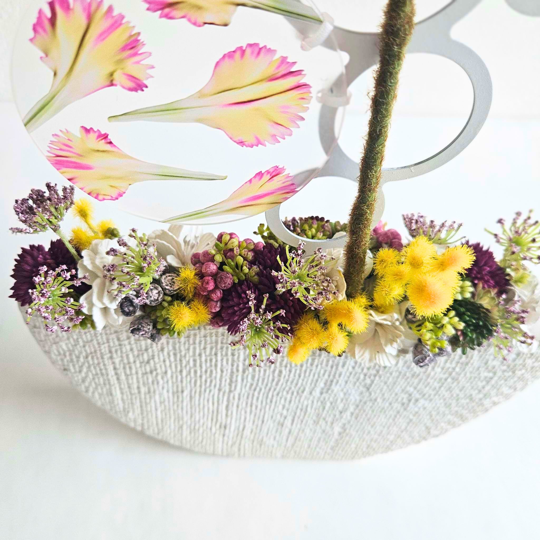 透明なアクリル樹脂に本物の植物が閉じ込められているような押し花風のカーネーションプレートとピンク・白・黄色の小花をミックスして白い器にアレンジしています。