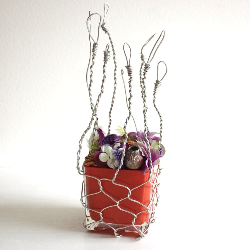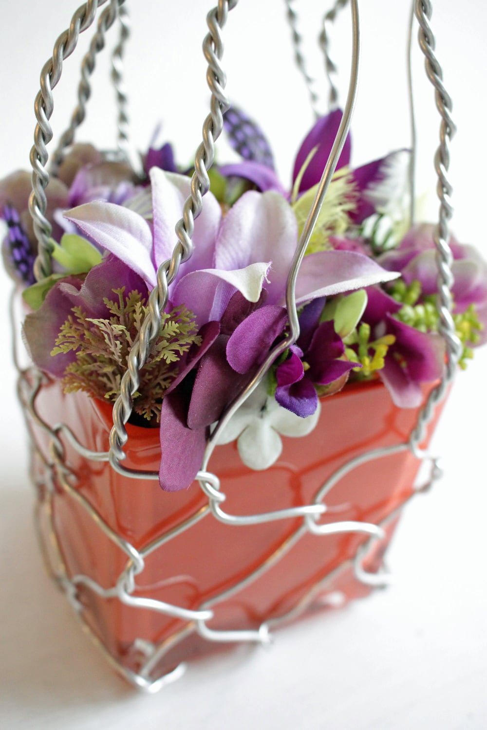 オレンジのガラス器をベースにアルミ線を使って編み込みアーティフィシャルフラワーでデザインしています。【ワイヤーの部分は自由に動きます】